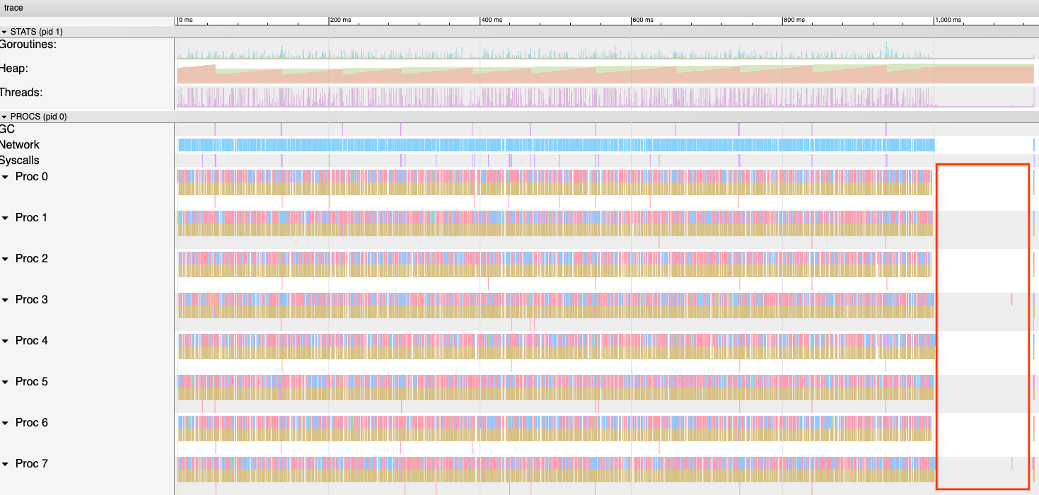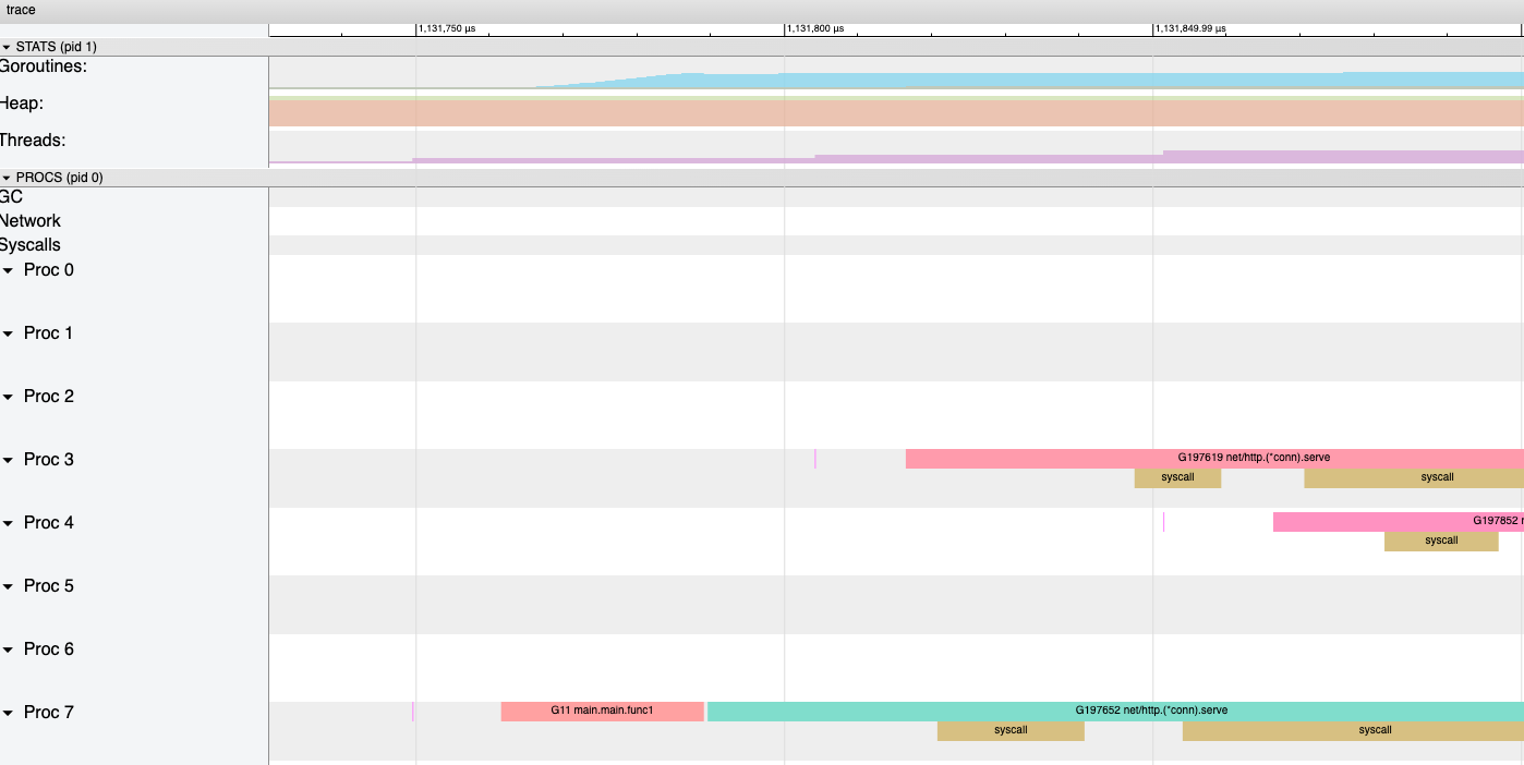 Below that, in the “PROCS” section, we can see how the execution of goroutines is mapped onto GOMAXPROCS (the number of operating system threads created by the Go application). We can see when and how each goroutine starts, runs, and finally stops executing.