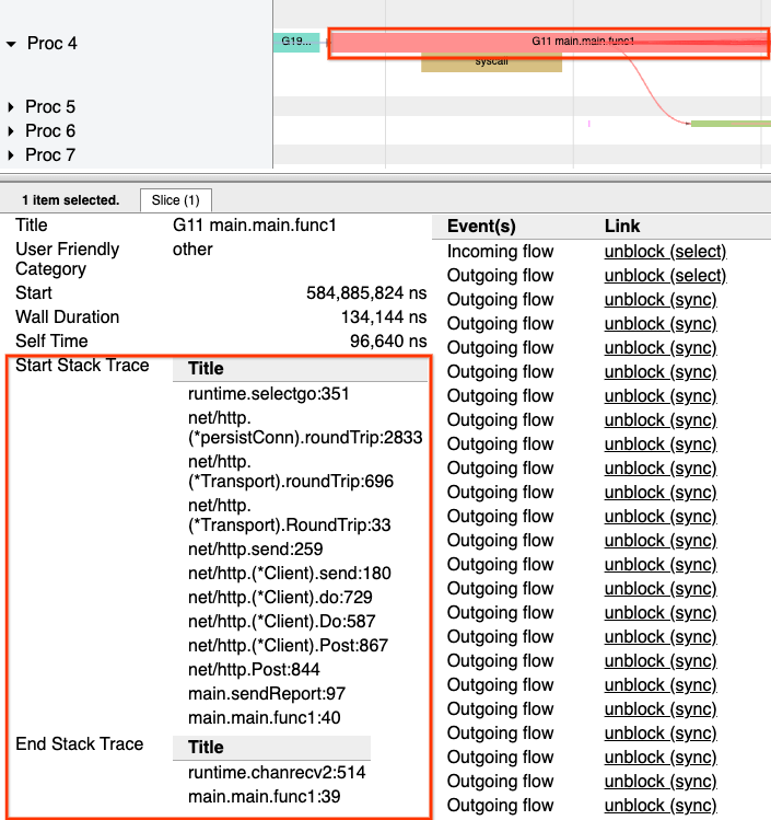 Clicking on the single goroutine shows an event table filled with outgoing flow events, which matches what we saw when the flow view was enabled.