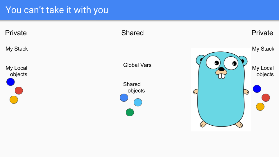 Goroutines are lightweight threads that look like Gophers, so here we have two Goroutines. They share some stuff such as the two blue objects there in the middle. They have their own private stacks and their own selection of private objects. Say the guy on the left wants to share the green object.