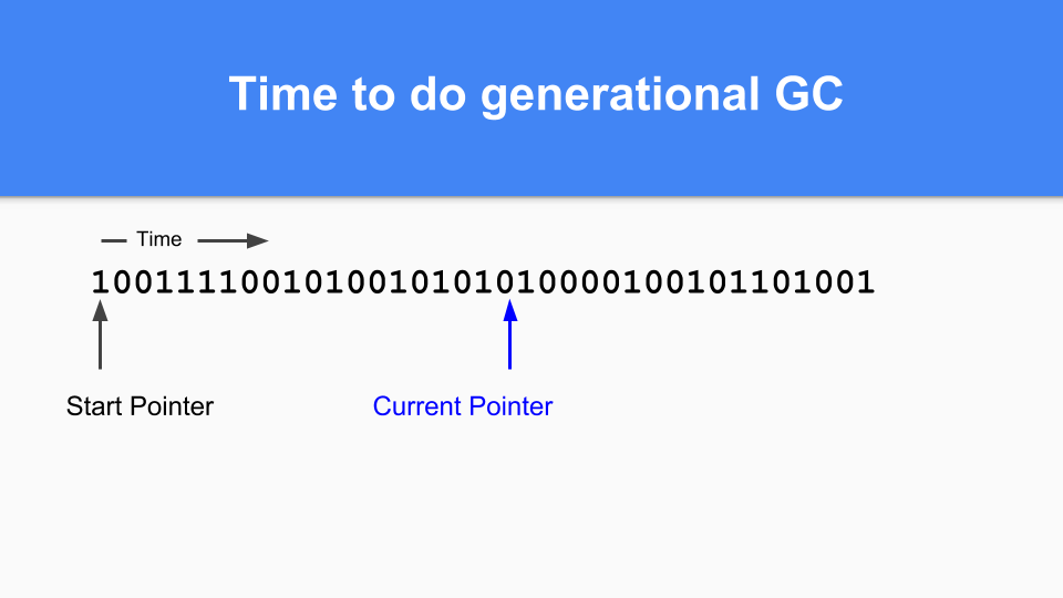 Finally, to finish your generational GC cycle you simply set the current pointer back to the start of the vector and you can continue. All the zeros weren’t reached during that GC cycle so are free and can be reused. As many of you know this is called ‘sticky bits’ and was invented by Hans Boehm and his colleagues.