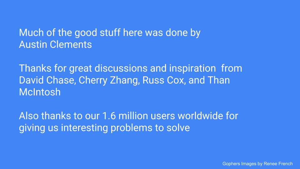 We also want to thank the 1.6 million Go users worldwide for giving us interesting problems to solve. Without them a lot of these problems would never come to light.