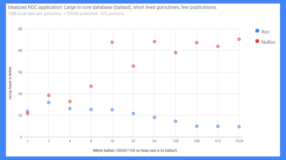 It’s true we scaled but we only had 4 to 12 hardware thread system so we couldn’t overcome the write barrier tax. Perhaps in the future when we have 128 core systems and Go is taking advantage of them, the scaling properties of ROC might be a win. When that happens we might come back and revisit this, but for now ROC was a losing proposition.