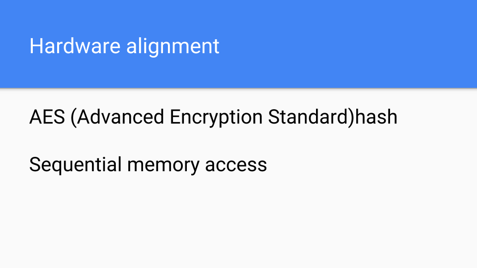 Today’s modern architectures have AES (Advanced Encryption Standard) instructions. One of those instructions can do encryption-grade hashing and with encryption-grade hashing we don’t have to worry about collisions if we also follow standard encryption policies. So hashing is not going to cost us much but we have to load up what we are going to hash. Fortunately we are walking through memory sequentially so we get really good memory and cache performance. If you have a DIMM and you hit sequential addresses, then it’s a win because they will be faster than hitting random addresses. The hardware prefetchers will kick in and that will also help. Anyway we have 50 years, 60 years of designing hardware to run Fortran, to run C, and to run the SPECint benchmarks. It’s no surprise that the result is hardware that runs this kind of stuff fast.