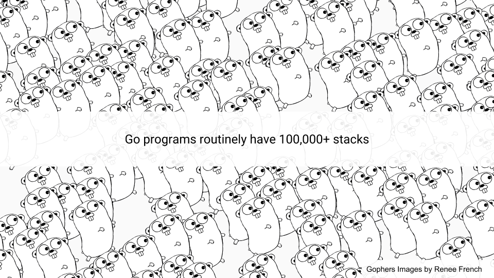 Well first of all Go programs have hundreds of thousands of stacks. They are managed by the Go scheduler and are always preempted at GC safepoints. The Go scheduler multiplexes Go routines onto OS threads which hopefully run with one OS thread per HW thread. We manage the stacks and their size by copying them and updating pointers in the stack. It’s a local operation so it scales fairly well.