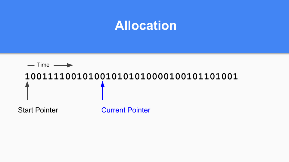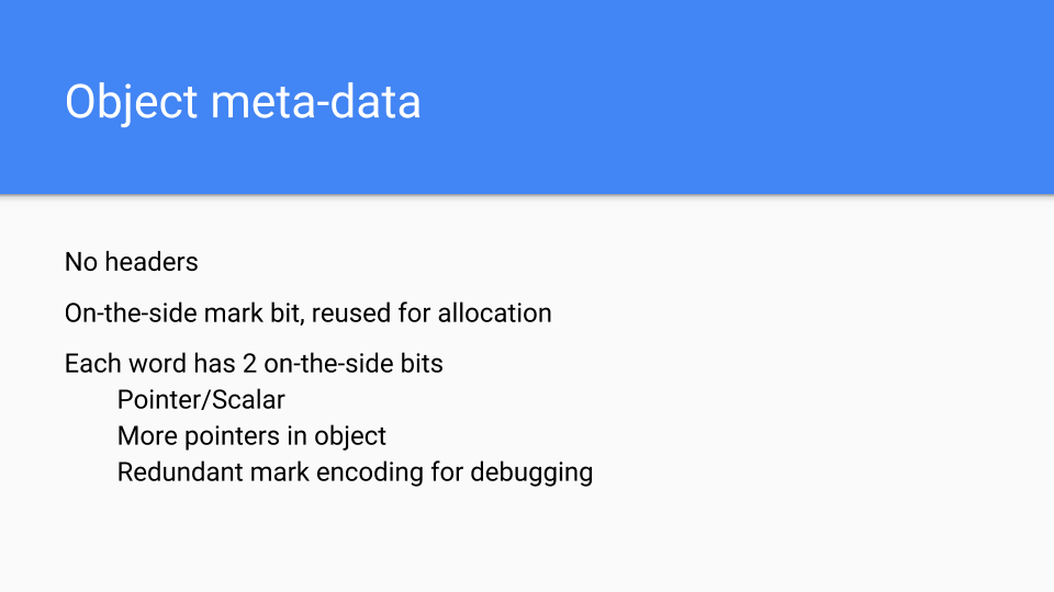 The next design choice was where to put the object’s metadata. We needed to have some information about the objects since we didn’t have headers. Mark bits are kept on the side and used for marking as well as allocation. Each word has 2 bits associated with it to tell you if it was a scalar or a pointer inside that word. It also encoded whether there were more pointers in the object so we could stop scanning objects sooner than later. We also had an extra bit encoding that we could use as an extra mark bit or to do other debugging things. This was really valuable for getting this stuff running and finding bugs.