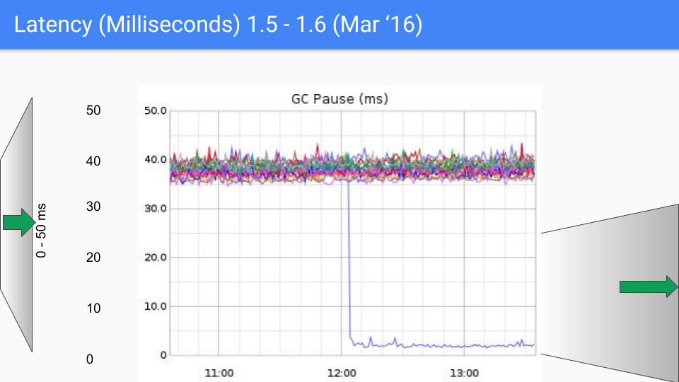 So here we are, this is August of 2016, a year after the first release. Again we kept knocking off these O(heap size) stop the world processes. We are talking about an 18Gbyte heap here. We had much larger heaps and as we knocked off these O(heap size) stop the world pauses, the size of the heap could obviously grow considerable without impacting latency. So this was a bit of a help in 1.7.