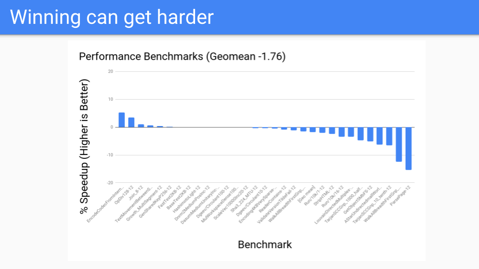 But that wasn’t good enough, we also had to make sure that ROC didn’t slow down other pieces of the system. At that point there was a lot of concern about our compiler and we could not slow down our compilers. Unfortunately the compilers were exactly the programs that ROC did not do well at. We were seeing 30, 40, 50% and more slowdowns and that was unacceptable. Go is proud of how fast its compiler is so we couldn’t slow the compiler down, certainly not this much.